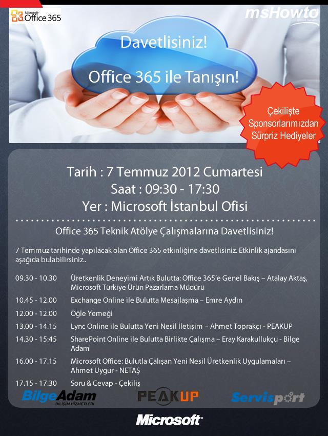 Yaz tatiline çıkmadan önce Microsoft, Servis Port, Peakup ve Bilge Adam’ın sponsorluğunda gerçekleştireceğimiz “Office 365 ile Tanışın” etkinliğine davetlisiniz.