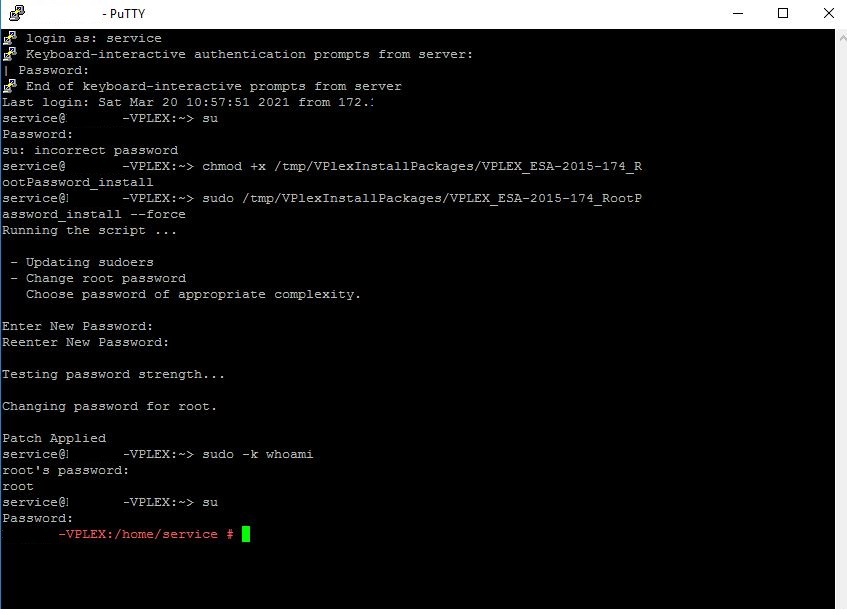service@ManagementServer:~> sudo /tmp/VPlexInstallPackages/VPLEX_ESA-2015-174_RootPassword_install –force