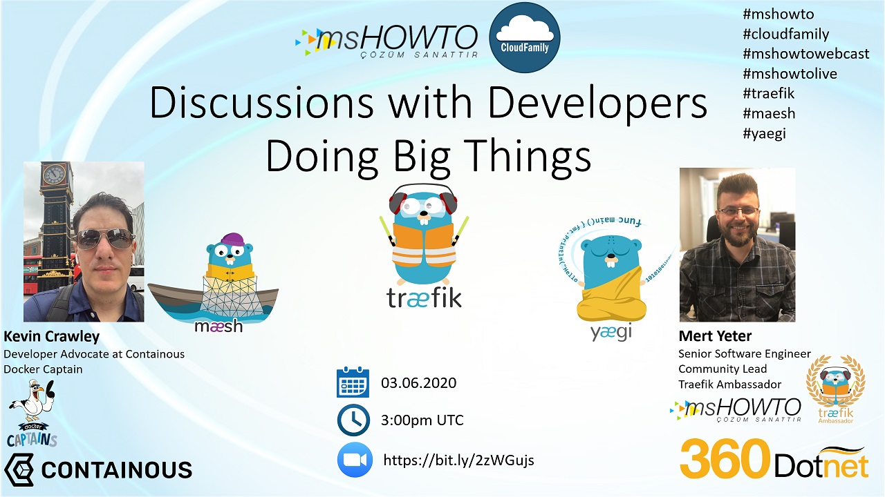 Mshowto yöneticilerimizden ve 360 Dotnet‘te Kıdemli Yazılım Mühendisi olan Mert Yeter ve Containous‘tan (Traefik‘i geliştiren şirket) Kevin Crawley ile birlikte 3 Haziran 2020 Çarşamba günü Saat: 15:00 – 16:00‘da “Developers Doing Big Things” webcast’ini gerçekleştirecekler.