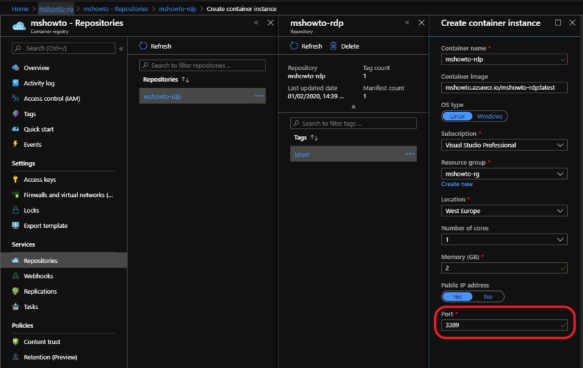 ACI üzerindeki repository’ye baktığımızda mshowto-rdp imajını görebiliyoruz (Resim-3). Bu imajdan bir instance oluşturup Azure üzerinde container’ın çalışmasını sağlayabiliriz. Container’a bağlanacağım için bir public IP istediğimi ve RDP portu olan 3389’u açmak istediğimi de belirtiyorum.