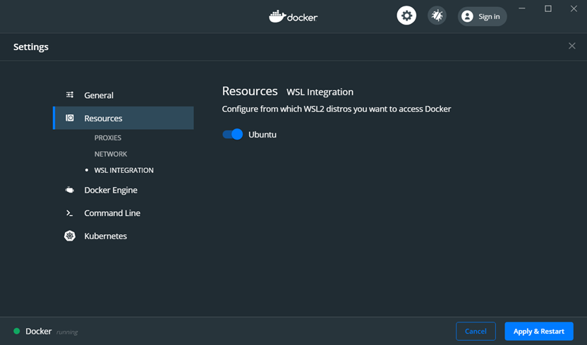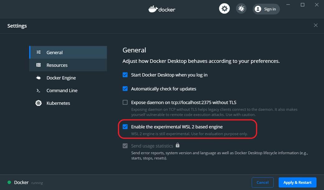 WSL2 desteğini aktif hale getirmek için Settings ekranından Resim-2‘de göreceğiniz “Enable the experimental WSL 2 based engine” seçeneğini seçip Apply & Restart’a tıklamanız yeterli.