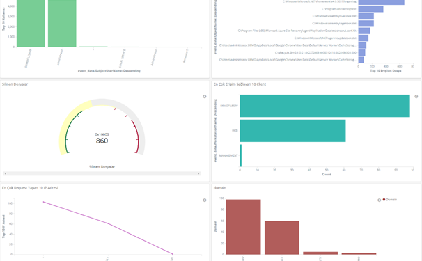 Hepsi tamamen Open Source olan Elasticsearch, Kibana ve Winlogbeat kullarak sizde aşağıdaki gibi bir Dashboard üzerinden Dosya Sunucunuzu takip edebilir, görmek istediğiniz kayıtlara hızlıca ulaşabilirsiniz. Görsel’in büyük halini görmek isterseniz Buraya tıklayın.