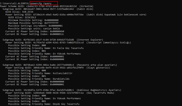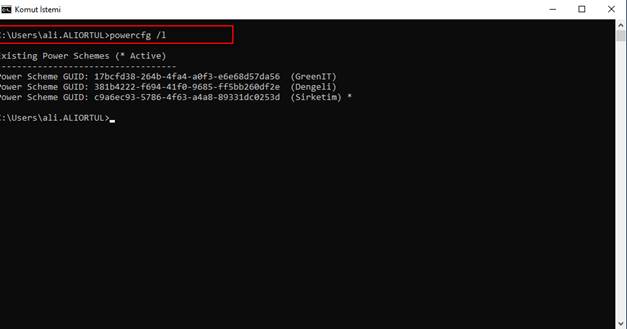 Powercfg /l veya Powercfg /List yazarak bilgisayarım üzerinde yer alan Power planları görebiliyorum.