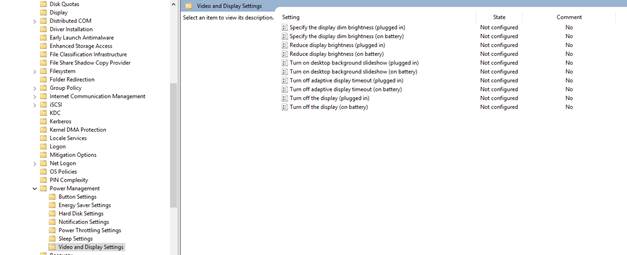 Son olarak video ve display politikalarını yönetebileceğimiz alan geliyor. Burada kullanıcıların monitörlerinin ışık seviyelerini ayarlayabileceğimiz gibi. Bilgisayar şu kadar süre kullanılmadığında otomatik olarak monitor kapansın gibi enerji tasarrufuna büyük etki eden görüntü aygıtlarına müdahaleyi planlayabiliyoruz.