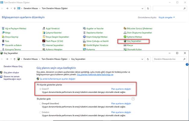 Client’ım üzerine gidip ilgili policy’leri hemen çekmesi için Gpupdate /force komutunu basıyorum ve Denetim Masası üzerinde Güç seçeneklerine geldiğimde create etmiş olduğum GreenIT planını clientın aldığını görüyorum.