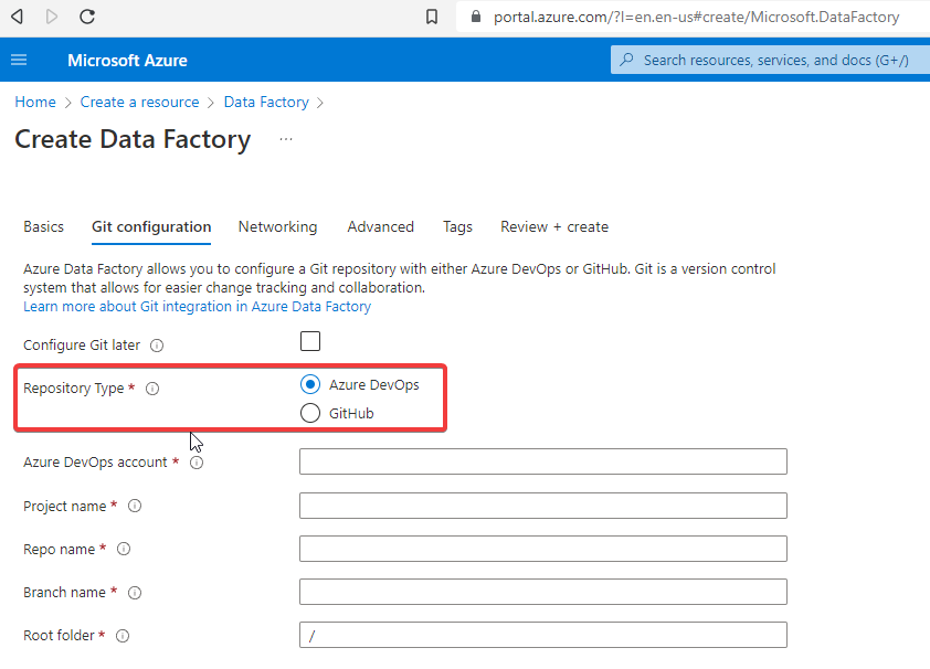 Bu ekranda Data Factory servisinize bir versiyon kontrol teknolojisi ekleyebilirsiniz. Eğer herhangi bir teknoloji eklemek istemiyorsanız ilk satırdaki Configure Git Later seçeneğini aktif hale getirmeniz gerekiyor. Aksi taktirde kurulum da bir sonraki aşamaya geçemeyeceksiniz.