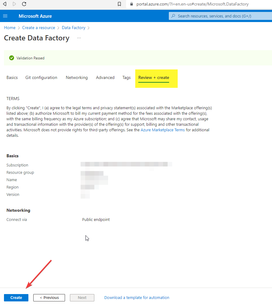 Tüm konfigürasyon işlemlerini tamamladıktan sonra Review + Create sekmesinde o ana kadar yaptığınız seçimlerin bir özetini görebilirsiniz. Eğer herhangi bir hata olduğunu düşünmüyorsanız Create butonuna tıklayarak saniyeler içerisinde Data Factory servisinizi oluşturabilirsiniz.