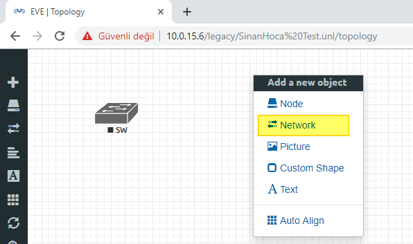 Switch’imizi başarıyla ekledikten sonra, kendi fiziksel ortamımız ve internet erişimi için test ortamımıza bir de ağ ekleyelim. Yine boş alanda sağ tuş / Network: