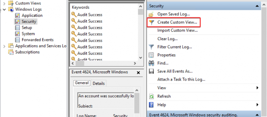 Event Viewer aracını açtıktan sonra sağ bölümde yer alan Actions Pane üzerinden Create Custom View seçiyoruz.