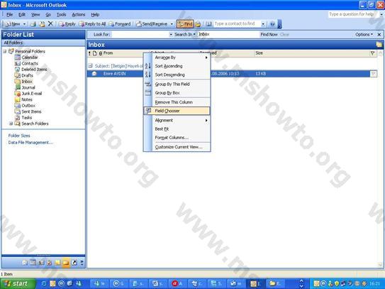 4- Inbox’ klasörünüzü seçtikten sonra şekil 3’teki gibi sütün başlıklarına sağ tıklayıp FIELD CHOOSER ‘ı seçin.
