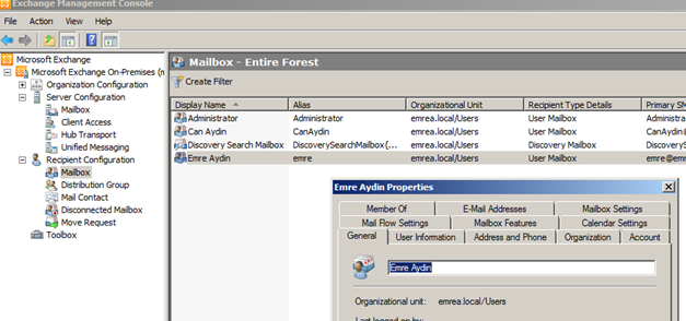 - Exchange Management Console’da, Recipient Configuration düğümünü genişletip ilgili Mailbox’ı seçin.