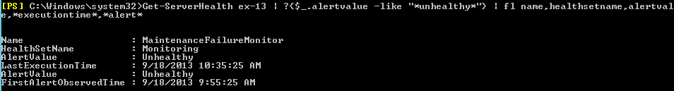 Get-ServerHealth komutu ile Exchange 2013 Health durumunu kontrol ettiğimde MaintenanceFailureMonitor için durum unhealthy olarak görünüyor.