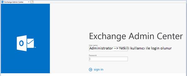 Exchange Admin Center arayüzüne yetkili kullanıcı ile mümkünse Administrator ile giriş yapiyoruz.