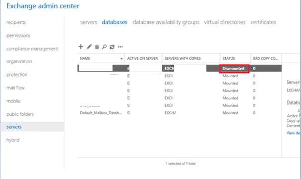 Evet status kisminda başarı ile dismount olduğunu gördük şimdi tekrar Database’i bağlamamiz gerekiyor Circular Logging kuralı çalışabilsin.