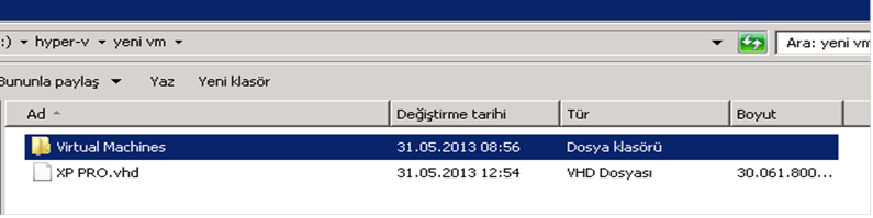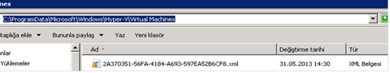 .Vhd dosyası ile birlikte sanal makine konfigürasyon dosyamız(2A370351-56FA-4184-A693-597EA52B6CF8.xml) aynı adlı klasör ile kopyalanmıştır.