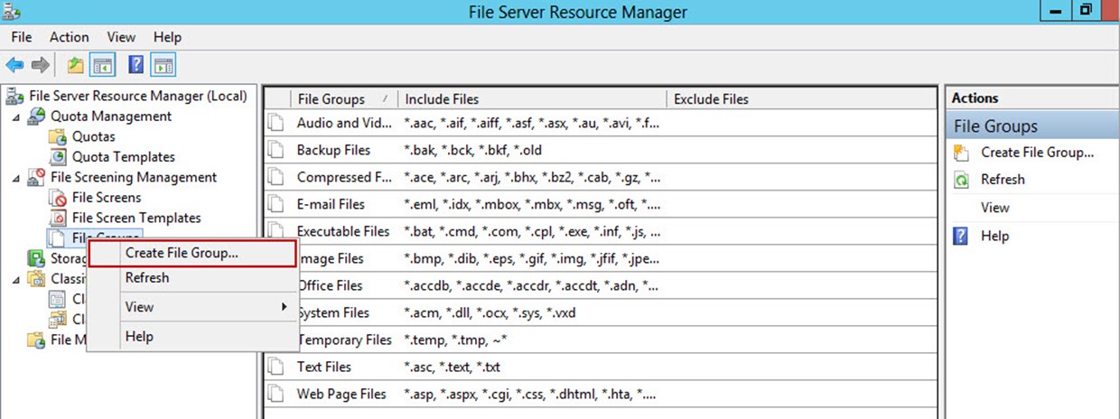 Amacımız .mp3 ve .avi yasaklamak olduğu için öncelikle File Groups üzerinde sağ tıklayıp Create File Group seçeneğini seçiyoruz.