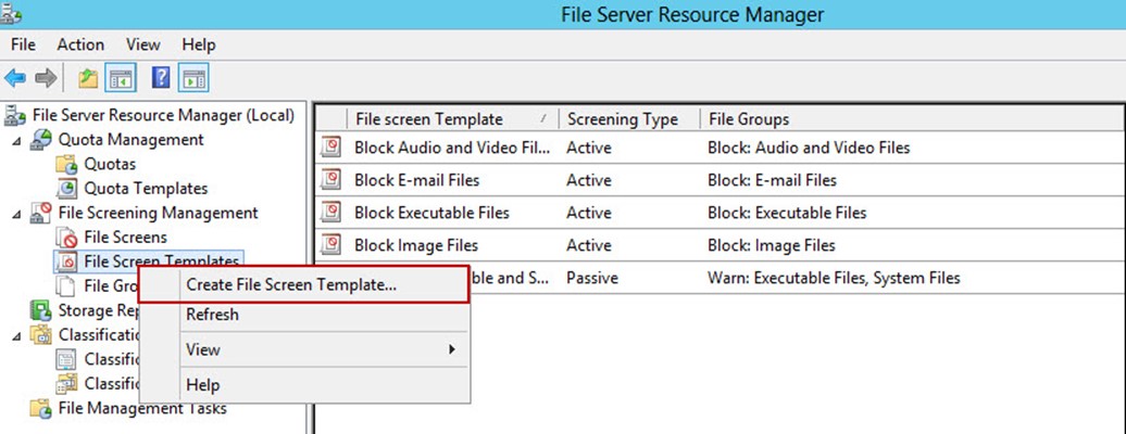 Kuralımızı oluşturduktan sonra şimdi sıra geldi bu kuralın geçerli olacağı şablona. Şablonumuzu oluşturmak için File Screen Templates üzerinde sağ tıklayıp Create File Screen Template seçeneğini seçiyoruz,