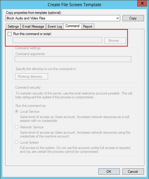 Bu adımda istersek hazırladığımız bir script ile bir takım işler yaptırabiliriz. Örnek vermek gerekirse; Oluşturduğunuz bir Quota şablonu var ve bunu bir klasöre bağladınız. Bağladınız bu klasöre 5 GB’lık alan verdiniz ve dediniz ki; bu alanın % 85 i dolunca bu scripti çalıştırıp klasördeki veriyi başka bir noktaya taşı.