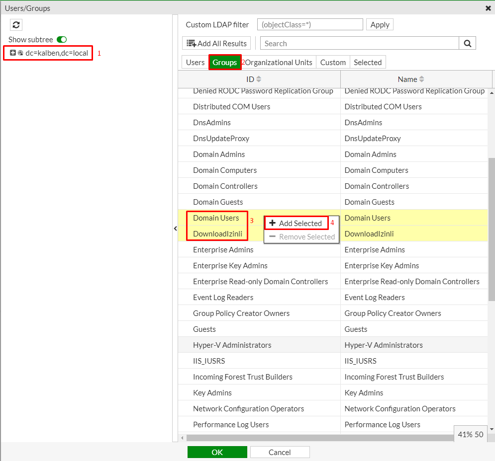 Users/Groups altında LDAP Distinguished Name seçili iken Grups tabına gelip seçmek istediğimiz grupları ctrl tuşuna basılı tutarak seçiyoruz. Daha sonra sağ tuşa basıp Add Selected alanına basıp istediğimiz grupları seçiyoruz.