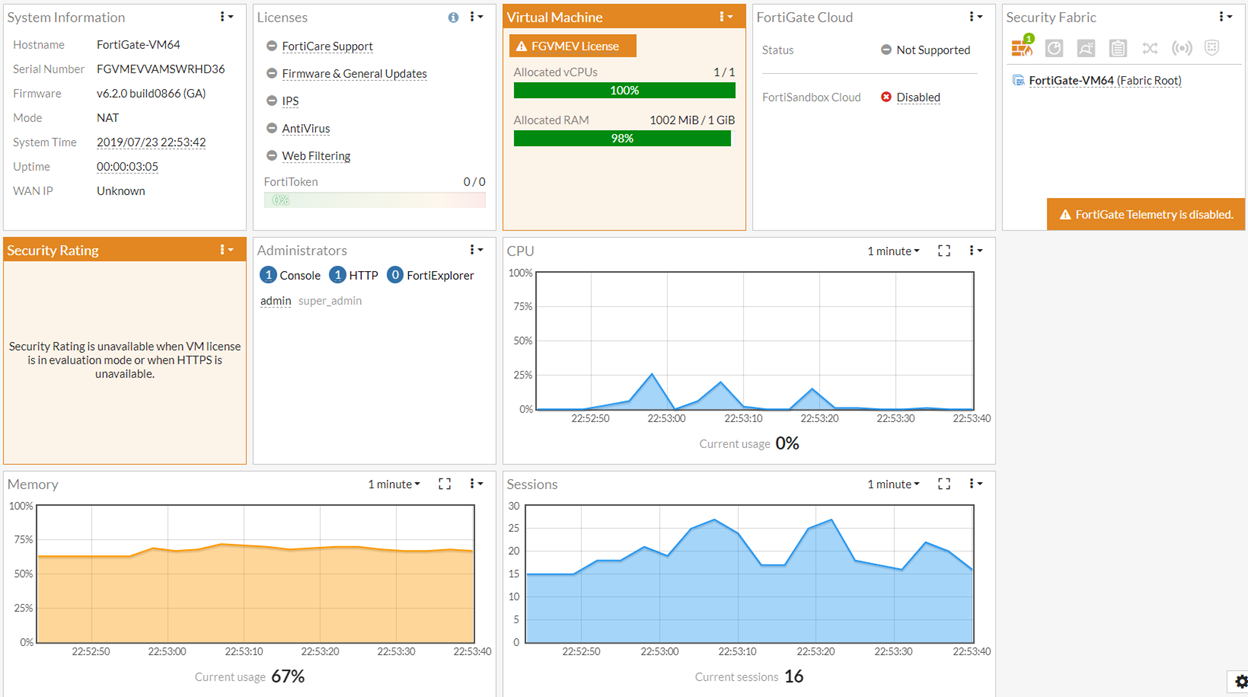 Virtual Machine: Bu alan FortiOS yazılımını sanal ortama kurduğumuz da göreceğimiz bir alandır. Bu alanda Lisans durumunu ve türünü, vCPU tahsisini ve kullanımını, Ram tahsisini ve kullanımını, VMX lisans bilgilerini görebiliriz.