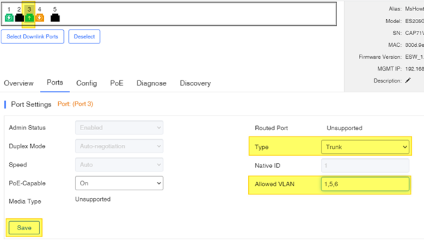 Sonrasında Fortigate’e giden portu Trunk yapmak için üstte 3 nolu porta tıklıyorum. Sağolsun Ruijie karıştırmamız için bize bu portun UPLINK port olduğunu ok’la da göstermiş. Bu portu Trunk yapıyoruz çünkü switch’deki birden çok vlan’ı ancak trunk bağlantı ile aktarabiliriz :