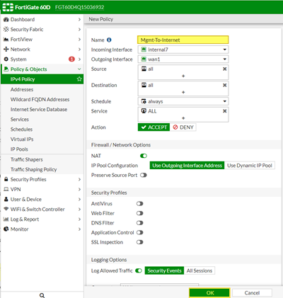 Şimdi de MGMT networküne internet veren kuralımızı girelim. Böylece cihazlar kendilerini Cloud’a register edebilsinler :