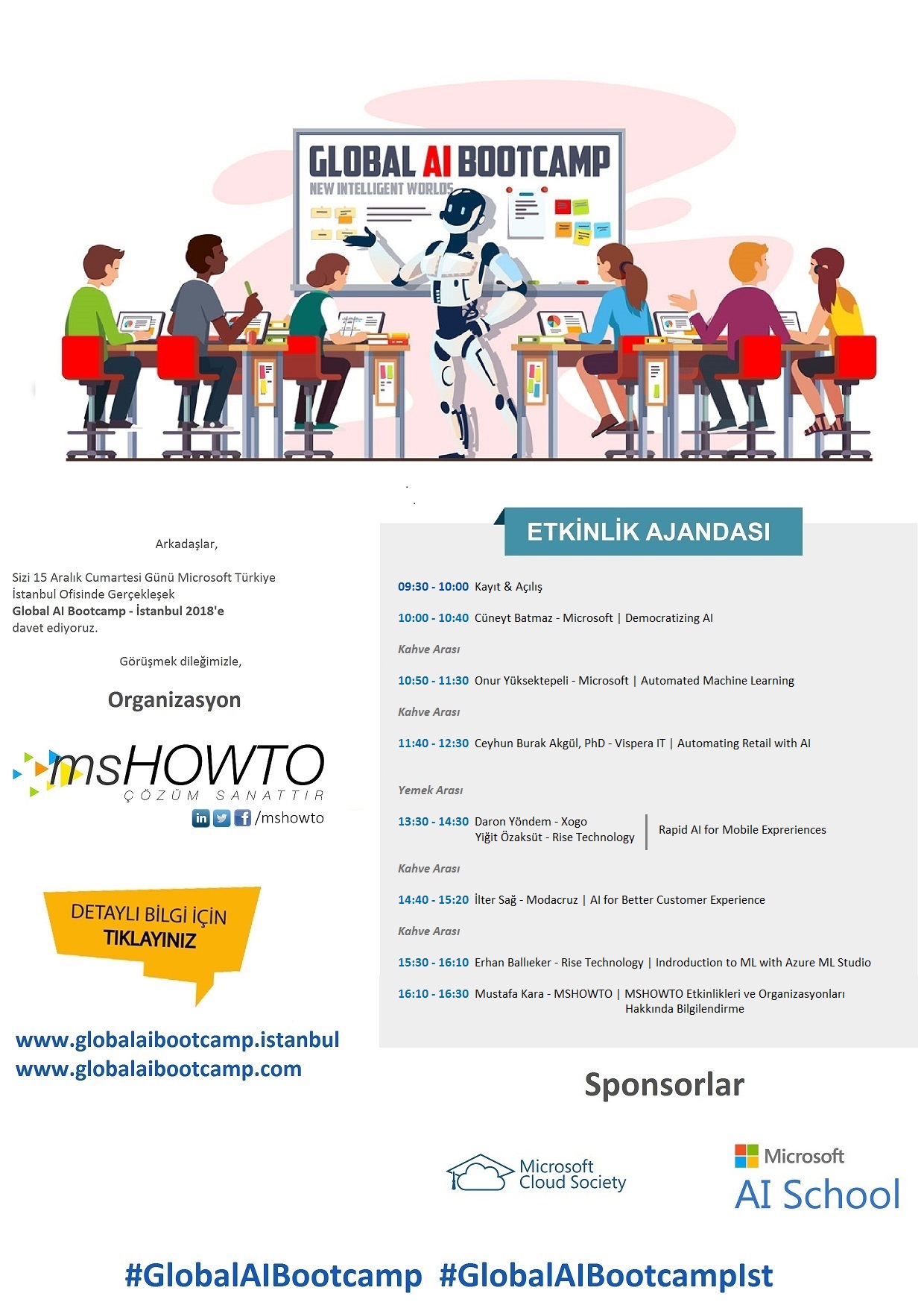 15 Aralık 2018 Cumartesi günü Microsoft Türkiye İstanbul ofisinde gerçekleşecek etkinlik hakkında daha fazla bilgi almak için www.globalaibootcamp.istanbul web sitesini ziyaret edebilirsiniz.