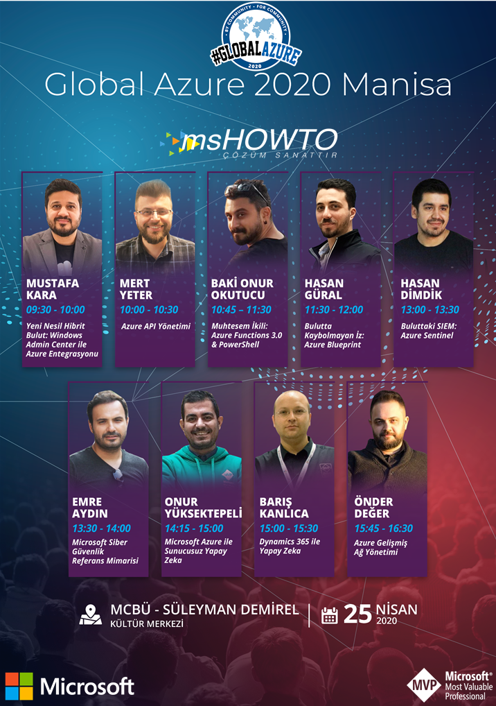 Global Azure 2020 Manisa etkinliğinde yer alacak konuşmacılar ve konularını belirlemiş ve 25 Nisan 2020 Cumartesi günü Manisa Celal Bayar Üniversitesinde yapmaya karar vermiştik. Bizlere kapılarını açan MCBÜ kulüpleri ve Üniversite yönetimine buradan bir kez daha teşekkür ederiz.