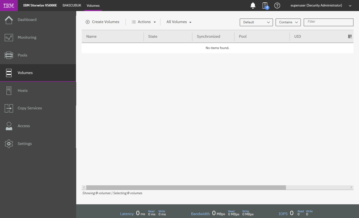 IBM Storwize V5010E Storage Management konsolu üzerinde Volumes menüsü geliyor karşımıza.