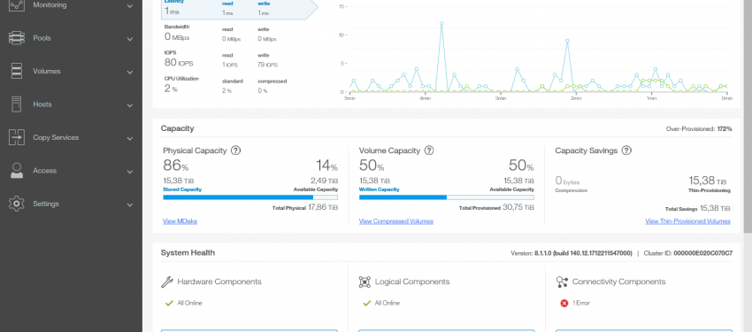 IBM Storwize V5030 Storage Management Konsolu üzerinde Dashboard menüsü geliyor karşımıza.