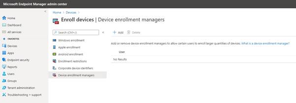 Microsoft Endpoint Manager Admin Center ekranında sırasıyla Devices -> Enroll Devices -> Device enrollment Managers ekranında Add butonu ile Device Enrollment Managers (DEM) kullanıcı adı ve şifresini girip ilerleyebilirsiniz.