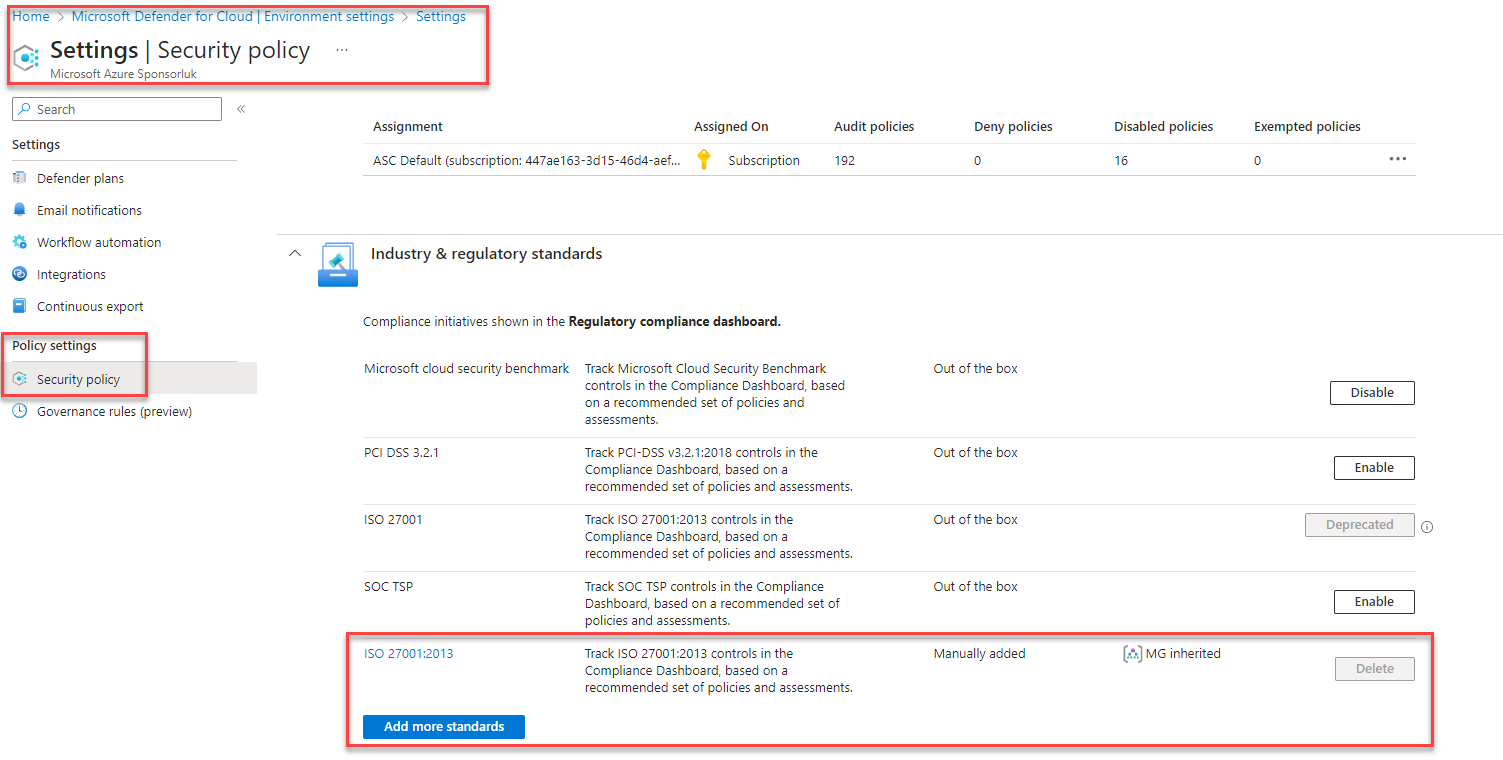 Azure Portal’da ISO 27001’i eklemek çok ama çok basit bunun için yapmanız gereken Azure Regulatory Compliance panosuna gelmek ve süzenleyici standartlar listesinden ISO 27001:2013’ü seçmektir. Çok kısa bir bilgilendirme yapmak istiyorum bu aşamada yakın zamanda ISO 27001’in eski uygulaması uyumluluk panosundan kaldırılacaktır. En kısa zamanda yeni ISO 27001:2013’ü kontrol panelinize eklemenizi tavsiye ederim.