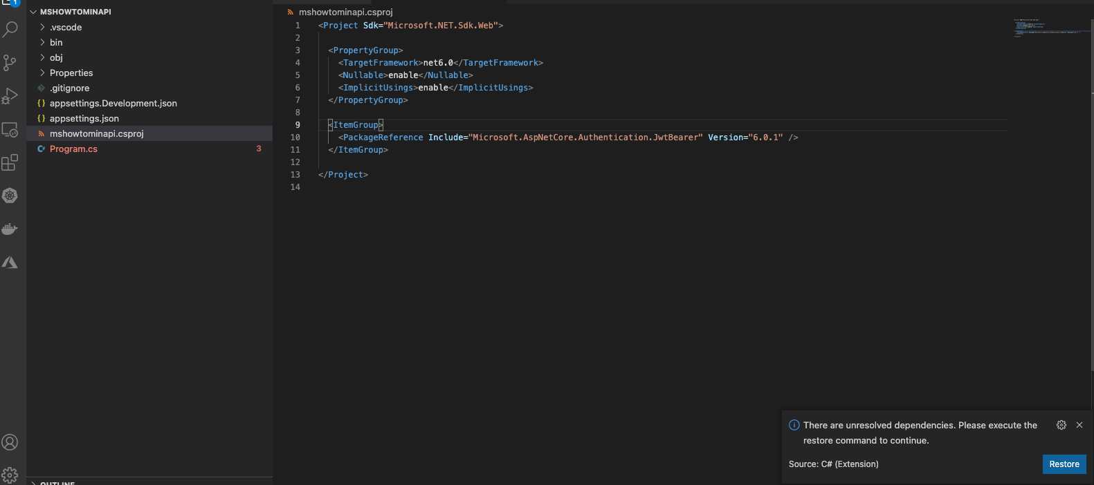 İlk olarak dotnet new web -o mshowtominapi komutu ile yeni bir web api oluşturup, dotnet new gitignore komutu ile gitignore dosyasını ekledikten sonra Visual Studio Code ile açıyorum (Resim-1). Asıl konumuz olmadığı için .NET 6 Minimal API detaylarına girmeyeceğim.