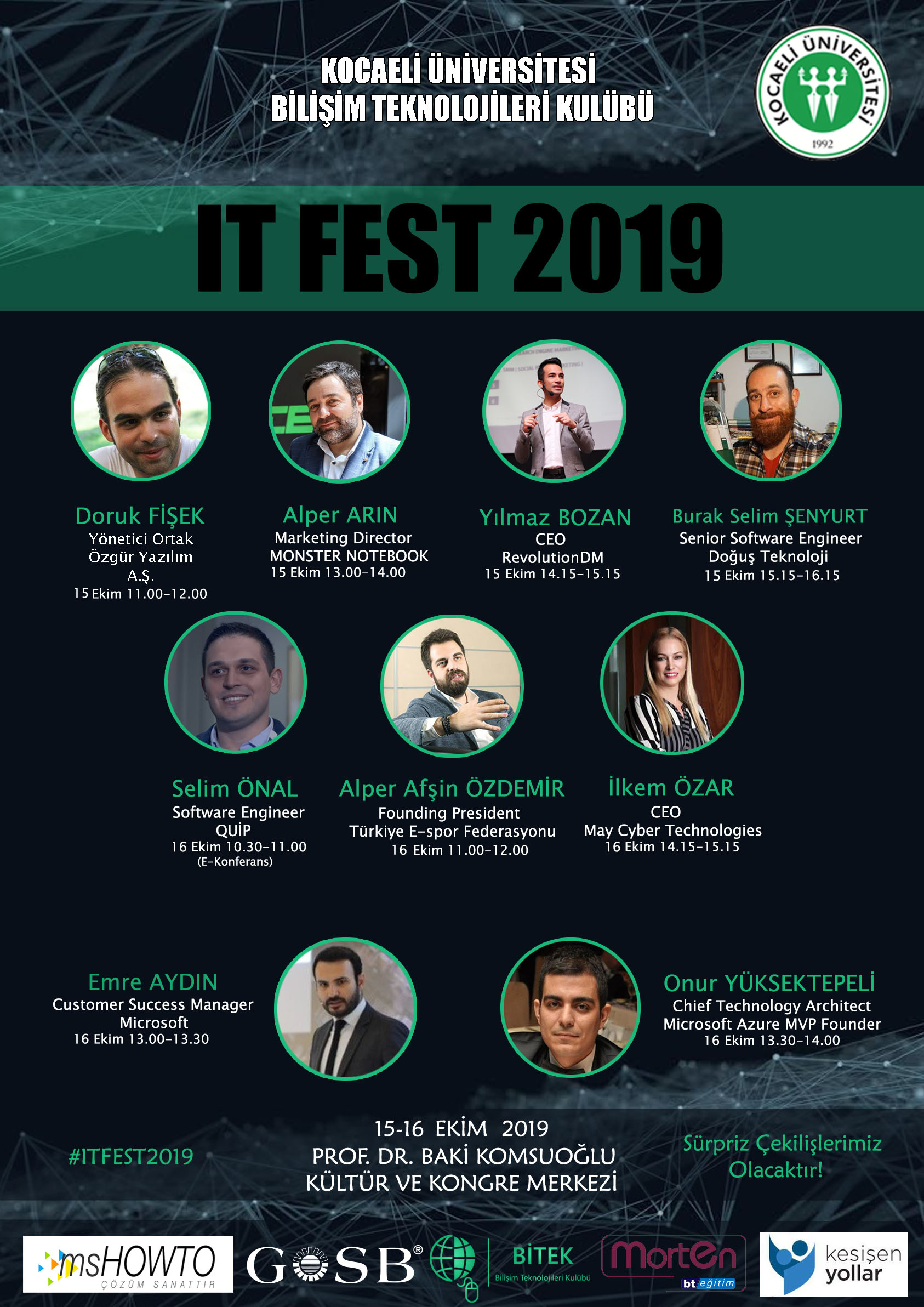 Kocaeli Üniversitesi Bilişim Teknolojileri Kulübü tarafından 15-16 Ekim tarihleri arasında düzenlenen IT Fest 2019 etkinliğinde bizlerde sevgili Kocaeli Üniversitesi öğrencileri ile birlikte olma şansı yakalayacağız.