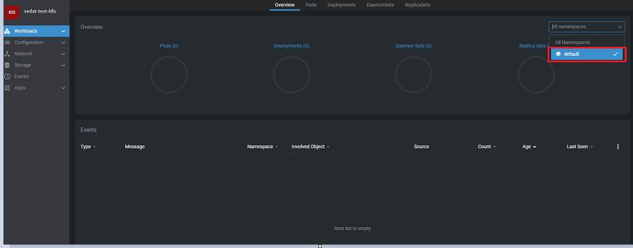 Kullanıcının yetkili olduğu namespace’i buradan da kontrol edebiliriz. Biz kullanıcımızı “default” namespace’inde yetkilendirdik.  Şuan ortamda herhangi bir deployment olmadığı için ekranlar temiz görünüyor :)