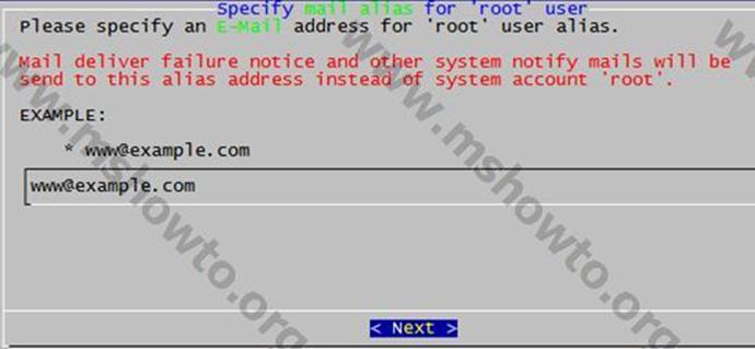 Root kullanıcın mail adresinin bu adres olacağına dair bir ekran veriyor isterseniz uyarılar vs. için adresi değiştirebilirsiniz.