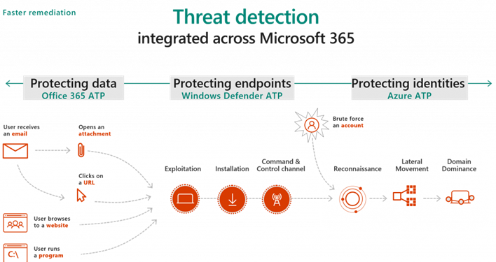 Koruma, ilk olarak kullanıcı kimliğiyle başlar ve tüm Microsoft 365 kullanıcı kimlikleri Azure Active Directory (Azure AD) servisini temel alınarak Azure AD Identity Protection tarafında korunur. Azure AD Identity Protection, kimlik gelişimlerine karşı otomatik olarak koruma sağlamak ve çeşitli gelişen risklere karşı kullanıcı bilgilerini güvence altına almak için dinamik ve makine öğrenim dilini desteklemektedir. Bu nedenle Office 365 kullanıcı kimlikleri bir adım daha güvence altındadır. Microsoft 365 threat protection, e-posta yoluyla gönderileni bilinmeyen gelişmiş tehdit ve saldırıları durdurmaya yardımcı olan Office 365 ATP ile maillerinizi korur. Office 365 ATP sayesinde, tüm e-posta üzerindeki linkleri ve eklentileri kontrol ederek zeka zararlı olup olmadığını belirleyip, zararlı olduğu fark ettiğinde taktirde maili farklı bir kullanıcıya daha göndermeden direk o maili siler. Saldırılar geniş çaplı olduğundan dolayı, bazı saldırılar direk cihazlara da yapılır. Fidye yazılımı içeren bir siteyi ziyaret eden bir kullanıcı yanlışlıkla fidye yazılımını windows 10 bilgisayarına indirdiğini varsayalım. Böyle bir durumda Microsoft Edge, bu sitenin kötü amaçlı olup olmadığını belirleyip, erişimi engelleyebilen ve fidye yazılımların ilk adımında güvenliği ele alan Windows Defender ATP’nin tarayıcı koruma özelliğini kullanır. Windows Defender ATP, Windows Defender Antivirus, AppLocker ve Windows Defender Device Guard gibi makinelerde varolan Windows güvenlik teknolojileriyle çalışır.