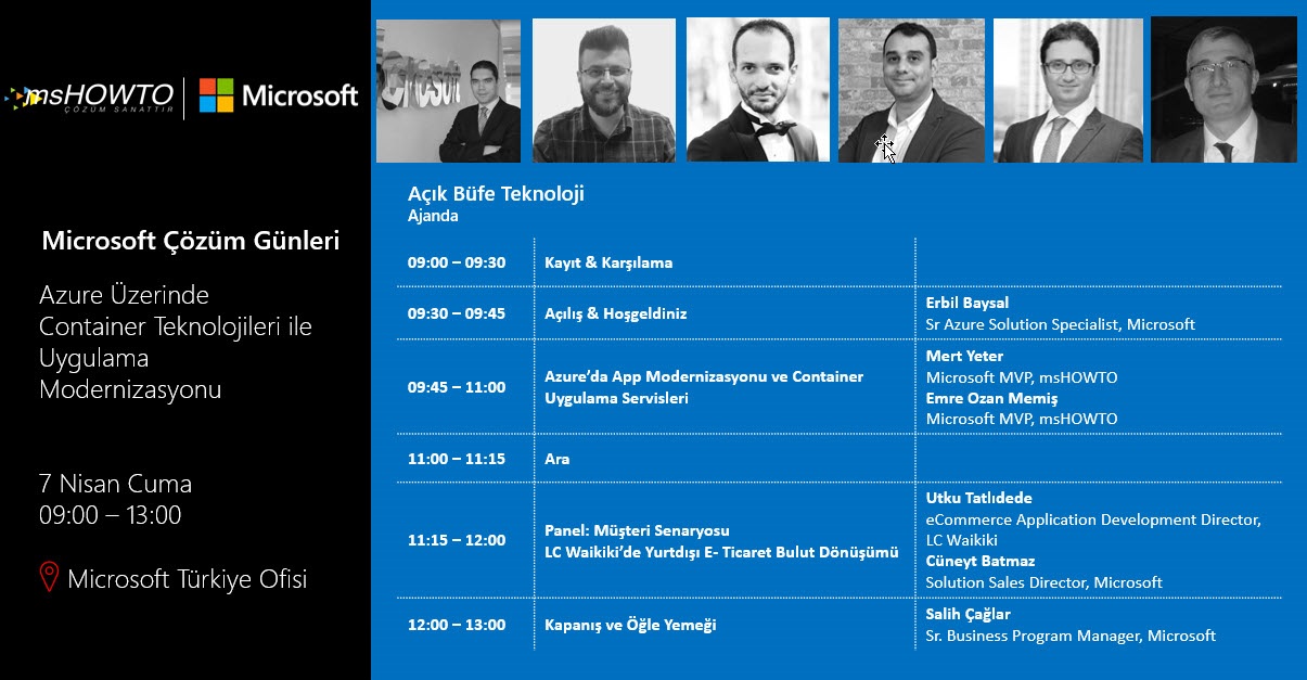 Mshowto Topluluğu ve çok değerli isimlerle birlikte Microsoft Türkiye ofisinde gerçekleştirdiğimiz Açık Büfe Teknoloji etkinlik serisi  Azure Üzerinde Container Teknolojileri ile Uygulama Modernizasyonu konusu ile devam ediyor.