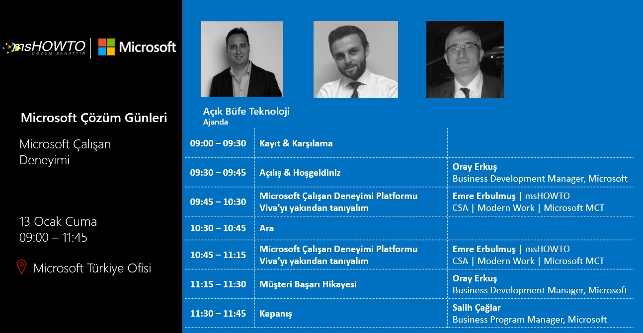 Mshowto Topluluğu ve çok değerli isimlerle birlikte Microsoft Türkiye ofisinde gerçekleşecek Açık Büfe Teknoloji serisinin ikinci etkinliğinde Çalışan Deneyimi Platformu Viva’yı yakından tanıyacağız.