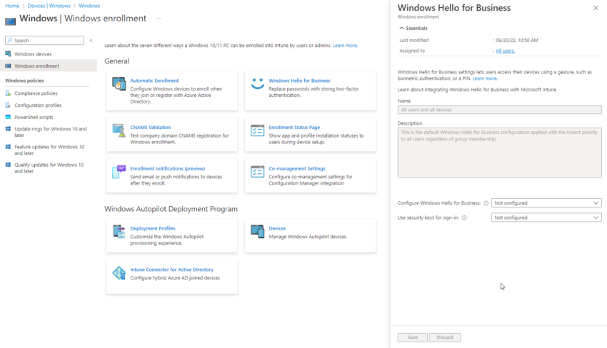 Microsoft Endpoint Manager ekranında Tenant bazında Windows Hello for Business yapılandırması için sırasıyla Devices>Windows(by platform)>Windows Enrollment>Windows Hello for Business yapılandırmasını kontrol edebilirsiniz.