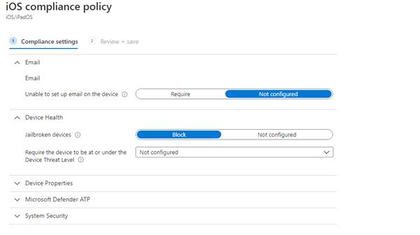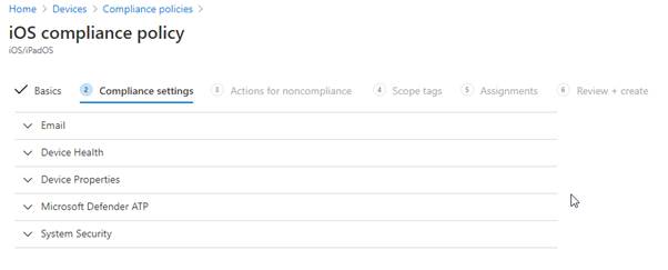 IOS/IPADOS uyumluluk politikaları temel olarak beş kategori altında toplanmaktadır: (Email, Device Health, Device Properties, Microsoft Defender ATP, System Security).
