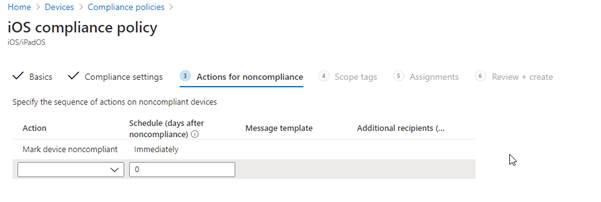 Action for non compliance bölümünde, cihaz uyumlu olmadığında Microsoft Intune hemen cihazı uyumlu değil olarak işaretlemektedir. Bu noktada iki türlü eylem gerçekleştirebilirsiniz: