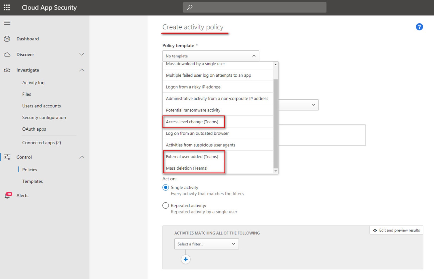 Cloud Apps Security portalı üzerinde Control – Policies altında Create Policy – Activity Policy adımlarını takip ederek, Teams Activity Policy Templates kuralları oluşturabilirsiniz.