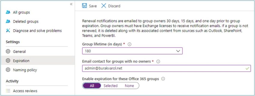 2- “Azure Active Directory > Groups > Expiration” menü ve seçenekleriyle ilerleyin.