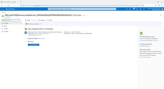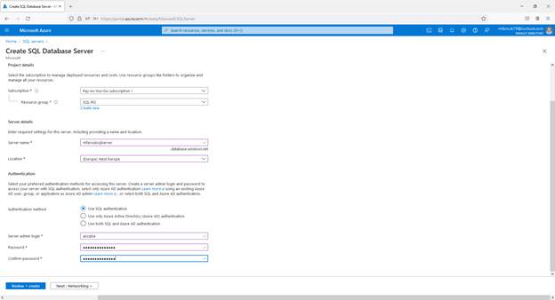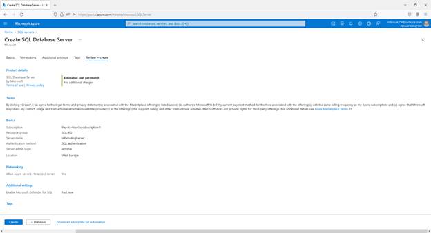 - Choose to allow Azure services and resources to access this server then click Review + Create