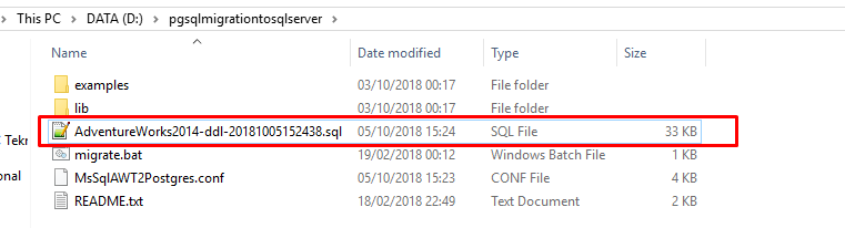 Projeyi de indirdikten sonra examples > bin içerisinde yer alan “migrate.bat” dosyası ve examples → conf içerisinde yer alan “MsSqlAWT2Postgres.conf” dosyalarını aynı projenin olduğu ana dizine alıyoruz.