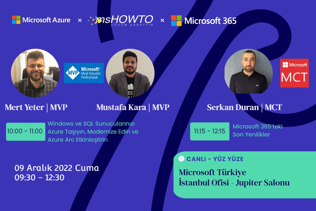 MSHOWTO Topluluğu olarak yılın son etkinliğini 9 Aralık 2022 Cuma günü Microsoft Türkiye İstanbul Ofisinde düzenliyoruz. Etkinlikte hem Microsoft Azure hem de Microsoft 365 özelinde iki oturumla sizlerle olacağız.