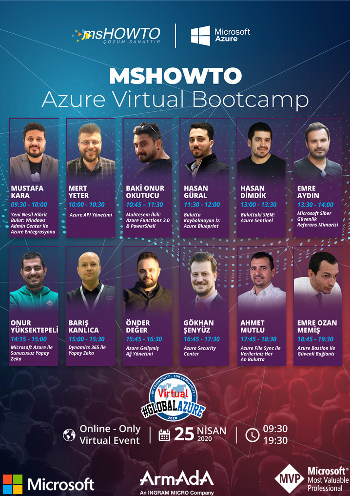 Global Azure yönetimini geçtiğimiz günlerde COVID-19 Virüsüne (Corona Virüs) karşı uygulanacak tedbirler kapsamında bu etkinliği belirtilen tarihlerde iptal etmesinden hem de ülkemizin aldığı tedbirler kapsamından dolayı bizlerde Manisa’da planladığımız Global Azure 2020 Manisa‘yı iptal ettiğimizi dün duyurmuştuk. Sizleri bu zor zamanlarda yalnız bırakmamak adına (umarız o tarihe kadar her şey yoluna girer) MSHOWTO | Azure Virtual Bootcamp yapmaya karar verdik.
