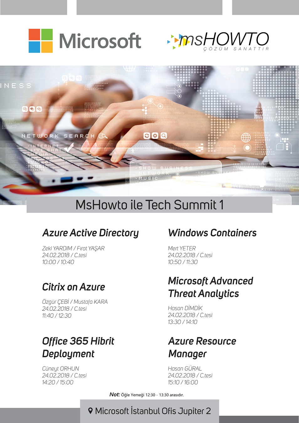 24 Şubat 2018 Cumartesi günü Microsoft İstanbul Ofisi Jupiter 2 salonunda yapacağımız etkinliğin detaylarını afişimizden inceleyebilirsiniz. Etkinliğimiz maalesef 75 kişi ile sınırlı olacağından vakit kaybeden kayıt işleminizi tamamlanızı öneririz.