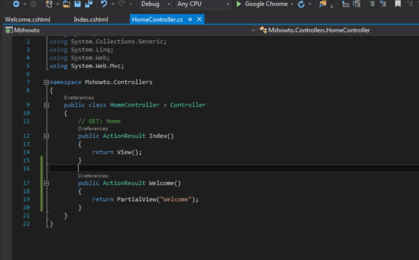 View içerisinde bulunan yazımız ekrana gelmiş oldu. Şimdi diğer Partial View çağırma yöntemlerine bakalım.
